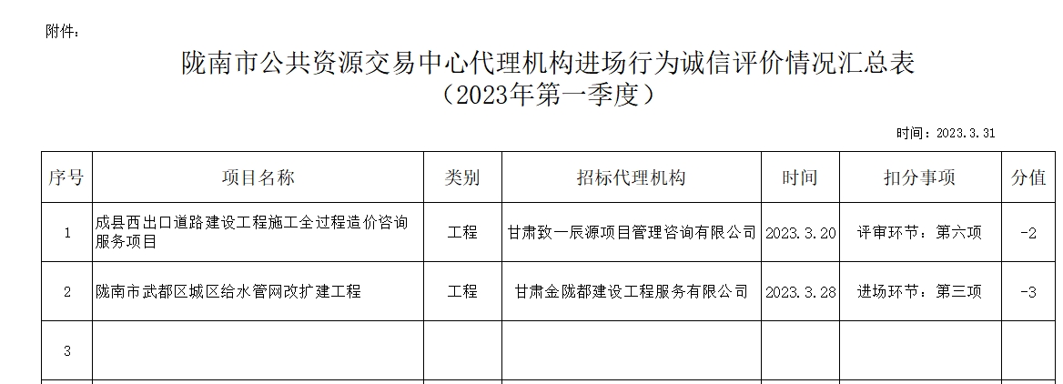 根據(jù)《甘肅省公共資源交易代理機(jī)構(gòu)管理辦法》(甘政辦發(fā)〔2019〕107號(hào))和《隴南市公共資源交易中心代理機(jī)構(gòu)進(jìn)場(chǎng)行為誠(chéng)信評(píng)價(jià)實(shí)施制度(試行)》規(guī)定,現(xiàn)對(duì)2023年第一季度,共2家代理機(jī)構(gòu)2條進(jìn)場(chǎng)行為誠(chéng)信評(píng)價(jià)記錄予以通報(bào)(詳見(jiàn)附表)。請(qǐng)各代理機(jī)構(gòu)嚴(yán)格遵守各項(xiàng)規(guī)章制度、誠(chéng)實(shí)守信,規(guī)范操作,為招標(biāo)人和采購(gòu)人提供專(zhuān)業(yè)、高效、規(guī)范的招標(biāo)代理服務(wù)。