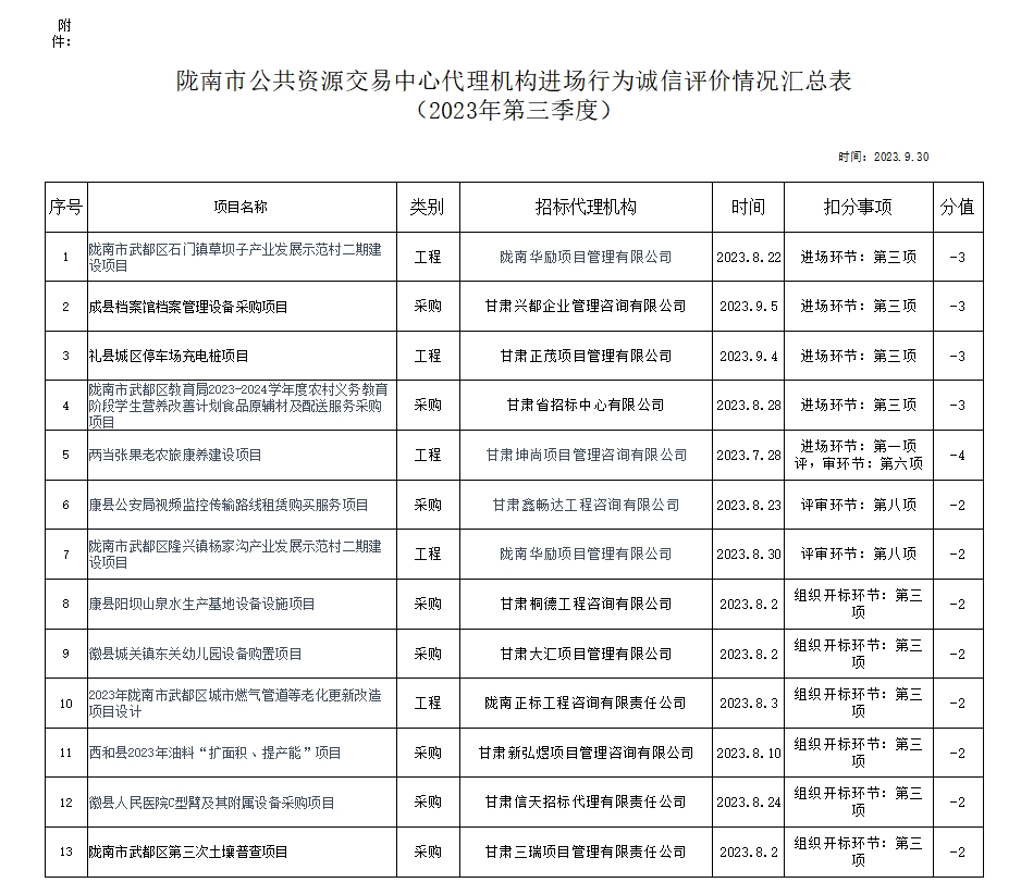 隴南市公共資源交易中心關(guān)于2023年第三季度代理機(jī)構(gòu)進(jìn)場(chǎng)行為誠(chéng)信評(píng)價(jià)結(jié)果的公示