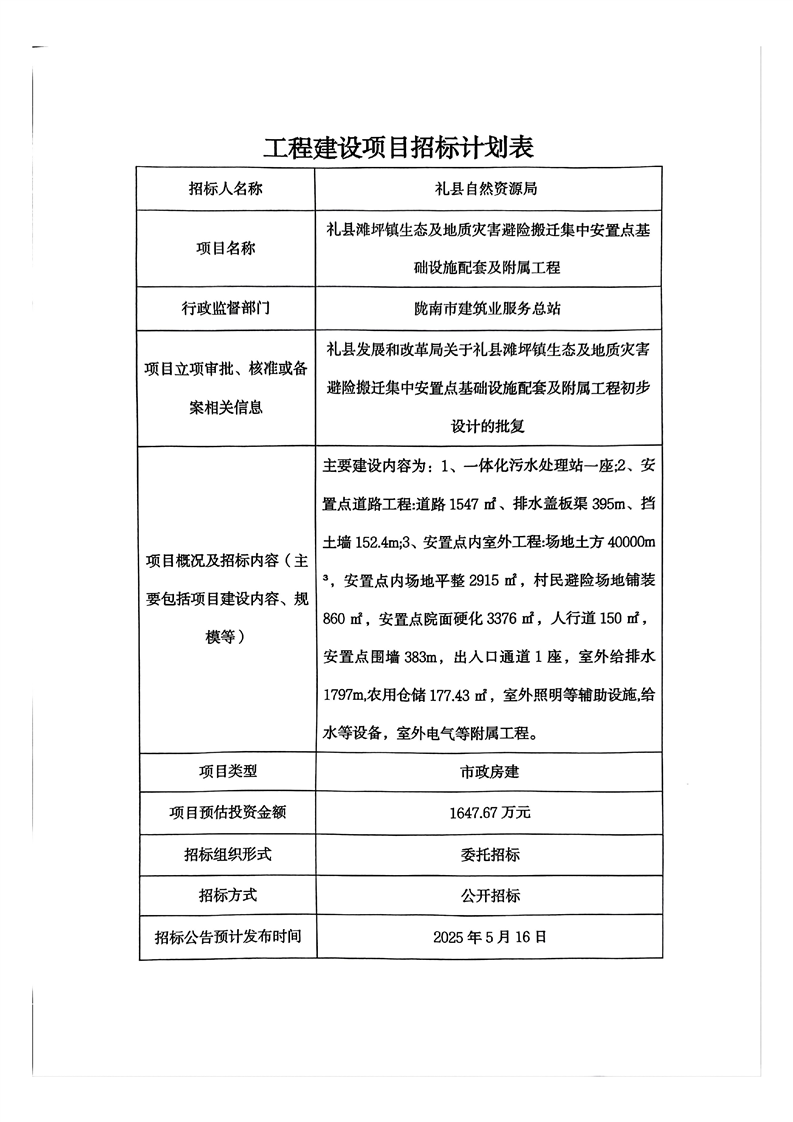 禮縣灘坪鎮(zhèn)生態(tài)及地質(zhì)災(zāi)害避險(xiǎn)搬遷集中安置點(diǎn)基礎(chǔ)設(shè)施配套及附屬工程