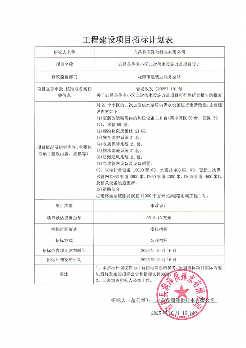 宕昌縣住宅小區(qū)二次供水設施改造項目設計