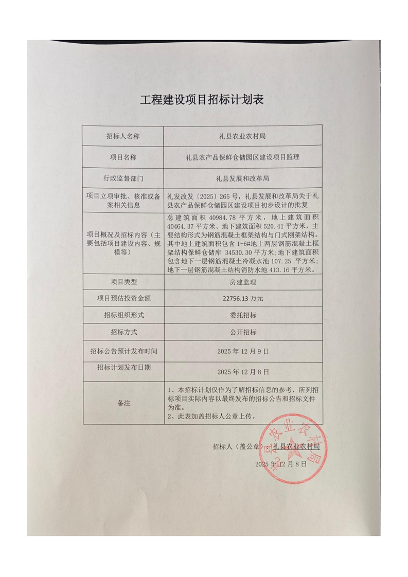 禮縣農(nóng)產(chǎn)品保鮮倉儲(chǔ)園區(qū)建設(shè)項(xiàng)目監(jiān)理