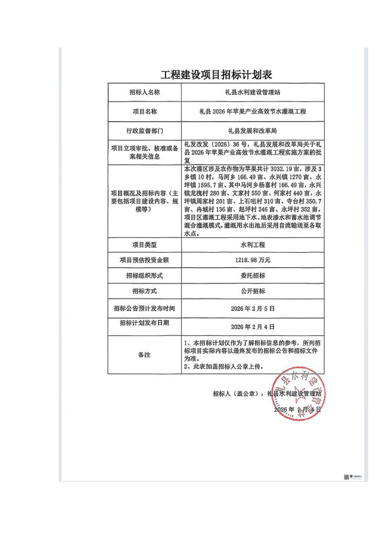 禮縣2026年蘋果產(chǎn)業(yè)高效節(jié)水灌溉工程
