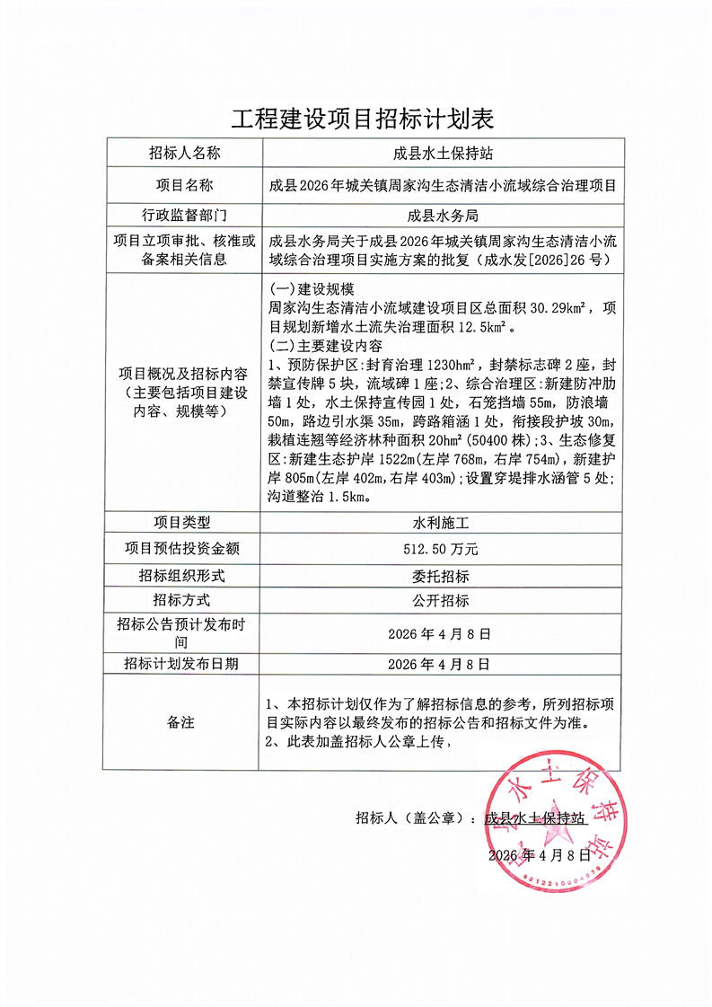 成縣2026年城關(guān)鎮(zhèn)周家溝生態(tài)清潔小流域綜合治理項(xiàng)目