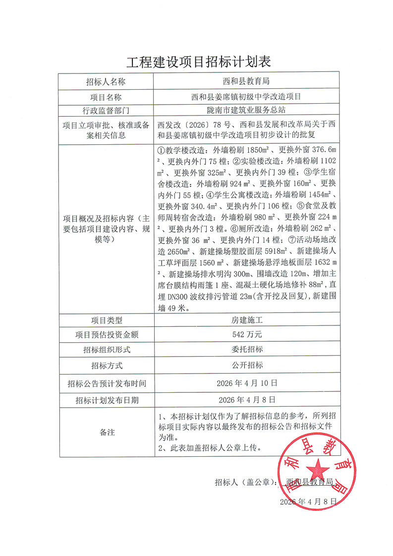 西和姜席初級(jí)中學(xué)招標(biāo)計(jì)劃表.pdf